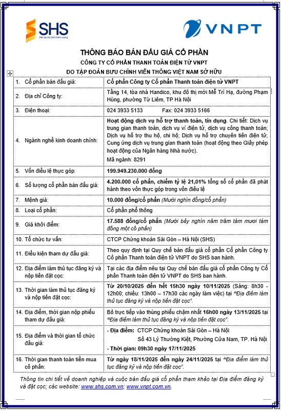 Tập đoàn Bưu chính Viễn thông Việt Nam (VNPT) xin thông báo về việc bán đấu giá cổ phần tại Công ty Cổ phần Thanh toán Điện tử VNPT do VNPT làm chủ sở hữu.