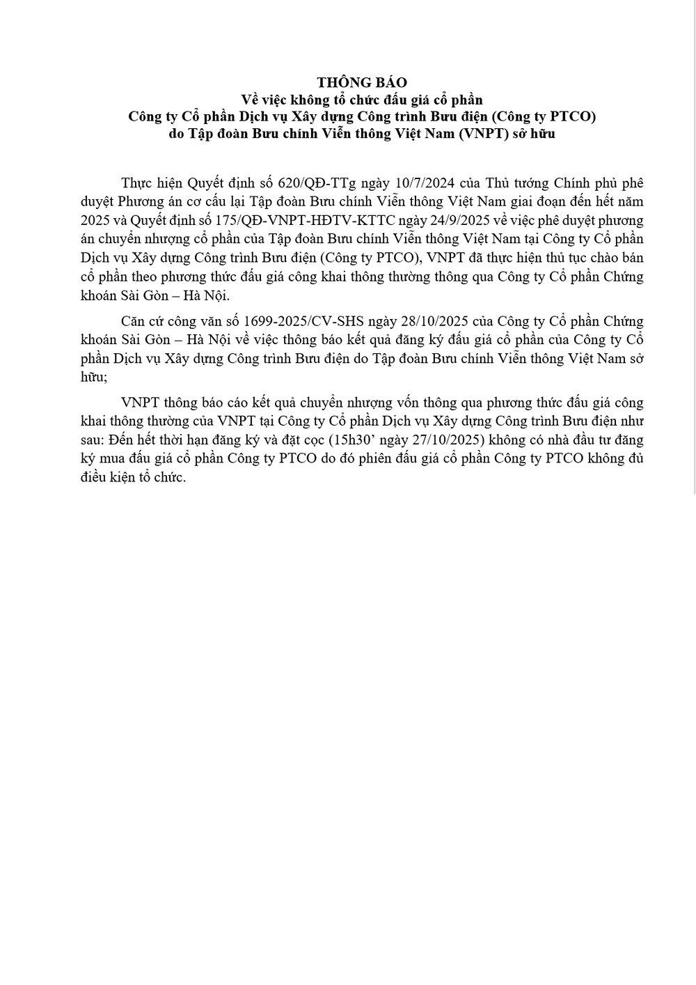 Tập đoàn Bưu chính Viễn thông Việt Nam (VNPT) xin thông báo về việc không tổ chức đấu giá cổ phần tại Công ty Cổ phần Dịch vụ Xây dựng Công trình Bưu điện (Công ty PTCO) do VNPT là chủ sở hữu.